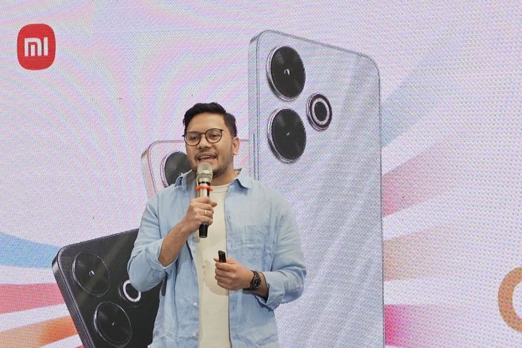 /Oik Yusuf Product Marketing Manager Xiaomi Indonesia Rendy Tonggo saat memperkenalkan Redmi 13 dalam acara peluncuran yang digelar di Jakarta,Rabu (5/6/2024)