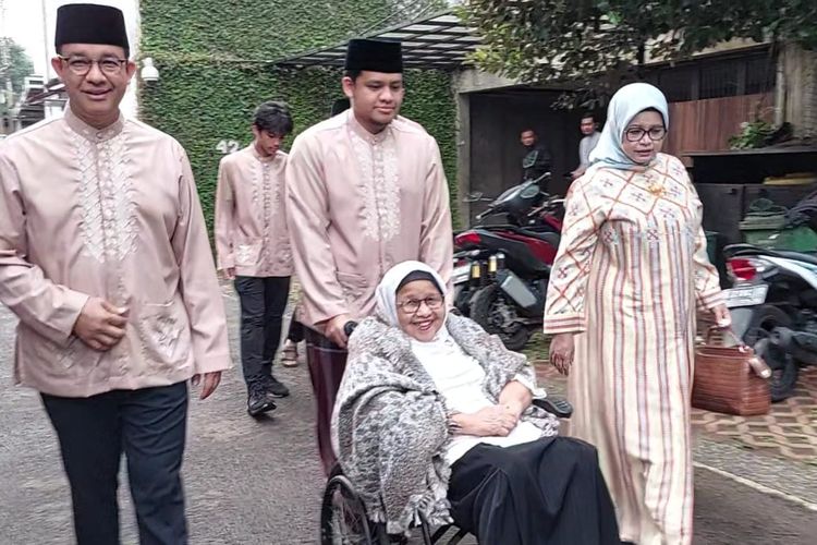 Anies beserta anak-anaknya kompak mengenakan baju koko coklat muda. Sementara itu,Fery terlihat menggunakan gamis berwarna senada.