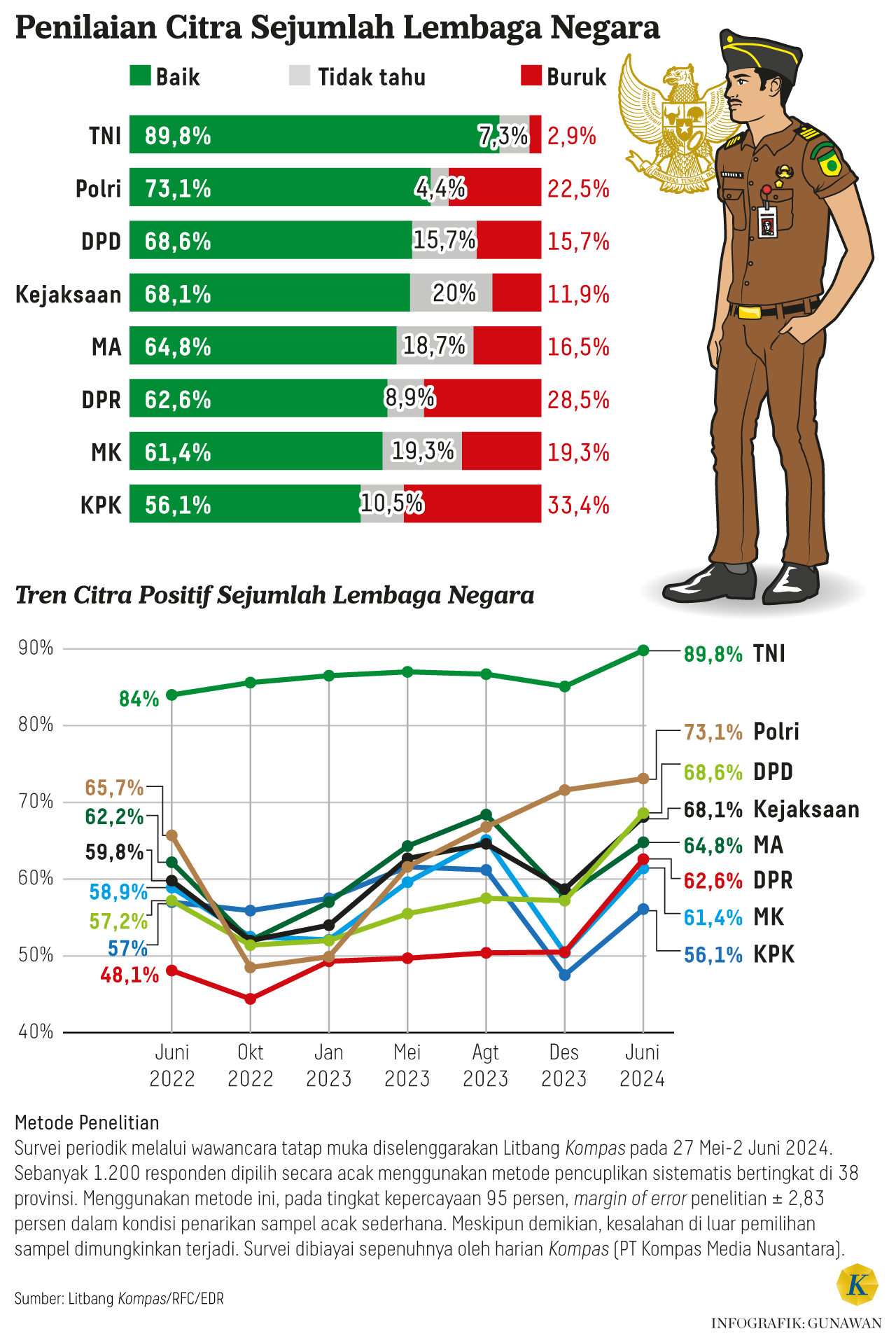 Berikut hasil survei Litbang Kompas periode Juni 2024 terkait penilaian citra sejumlah lembaga negara: