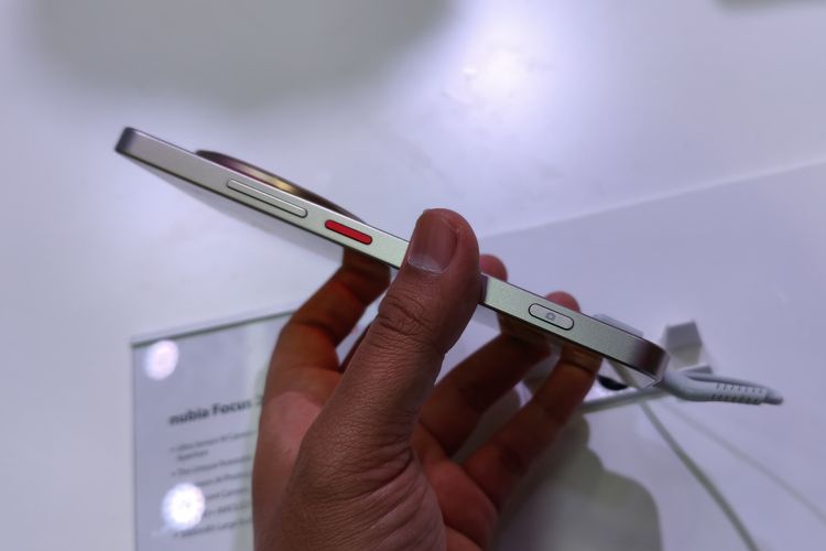KOMPAS.com/Bill Clinten. Tombol shutter kamera di sisi kanan Nubia Focus 2 Ultra,saat diorientasikan landscape,tombol shutter akan berada di sisi kanan atas.
