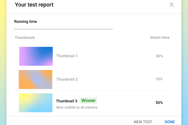 Nantinya,kreator juga dapat melihat label "preffered" atau lebih disukai ketika pengujian thumbnail telah usai. Ini berarti,thumbnail tersebut cenderung mengungguli thumbnail lain berdasarkan waktu tontonnya,