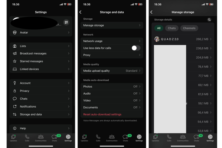 Nantinya Anda akan melihat daftar kontak “Chats” paling atas dengan detail ukuran penyimpanan yang dimiliki