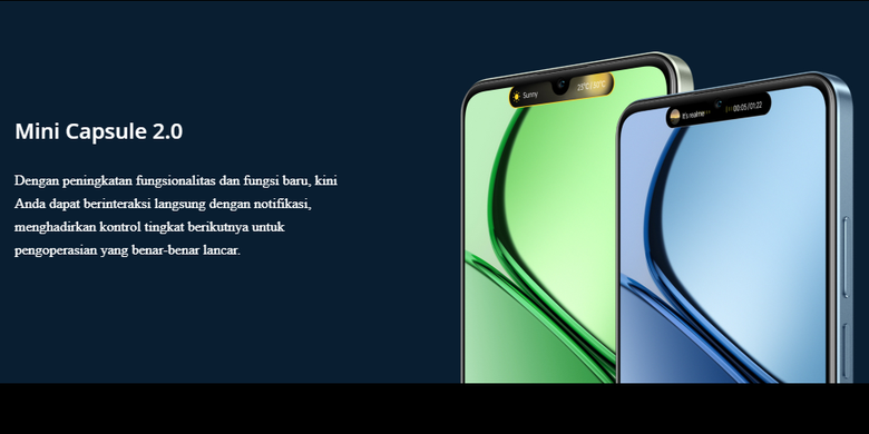 Realme Indonesia Realme C63 dilengkapi dengan fitur Mini Capsule 2.0.Redmi 13: layar IPS LCD 6,79 inci,resolusi Full HD Plus (2.460 x 1.080 piksel),refresh rate 90 Hz,brightness maksimum 550 nits,kerapatan piksel 396 ppi.Realme C63: layar LCD 6,74 inci,resolusi HD Plus,kecerahan puncak 560 nit,dan touch sampling rate 180 Hz.Baca juga: HP Realme C63 Resmi Meluncur di Indonesia,Ini HarganyaLayar ini punya poni mirip Dynamic Island iPhone. Poni tersebut didukung fitur Mini Capsule 2.0 yang akan memunculkan animasi ketika ada notifikasi.