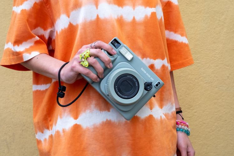 Fujifilm Ilustrasi bodi Fujifilm Instax Wide 400 yang dipegang dalam satu genggaman tangan
