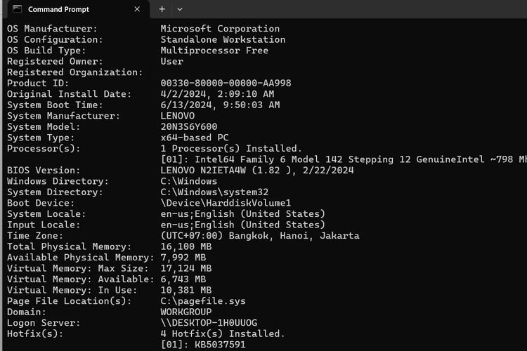 KOMPAS.com/Zulfikar Hardiansyah Ilustrasi cara cek spek laptop Windows 10 via Command Prompt.