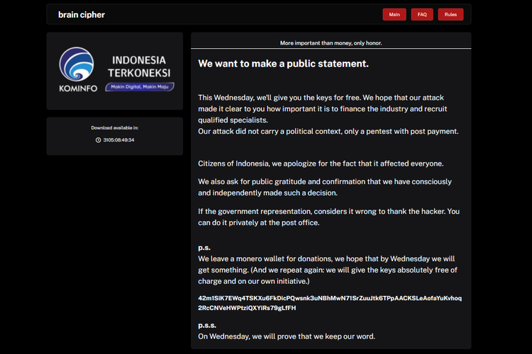 iDoPress - Brain Cipher,kelompok peretas (hacker) yang menyerang Pusat Data Nasional Sementara (PDNS) 2 di Surabaya,akhirnya membuat pernyataan terbuka.