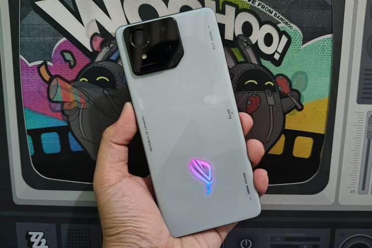 Kompas.com/BILL CLINTEN Desain belakang Asus ROG Phone 8. Tampilan punggung ponsel ini kini lebih sederhana dan minimalis. Bisa dilihat,dan macro 5 MP.