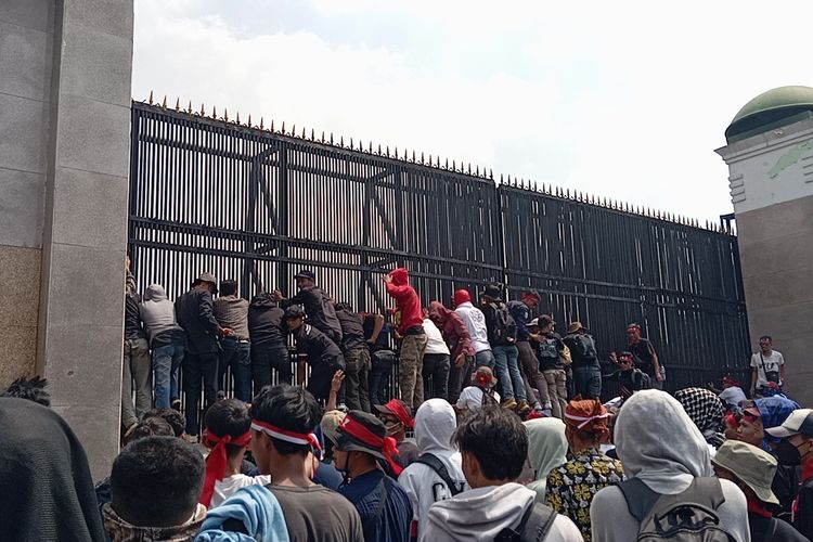 Sekitar 20 pemuda naik ke atas dinding beton yang ditaruh di depan gerbang. Mereka menarik dan mendorong gerbang hitam itu hingga mengeluarkan suara gaduh.