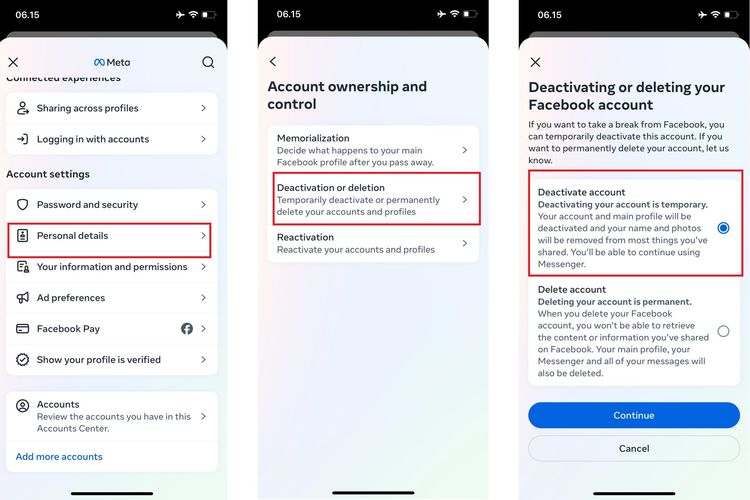 Kemudian,klik opsi “Lanjutkan” dan ikuti petunjuk untuk mengonfirmasi penghapusan akun Facebook sementara.
