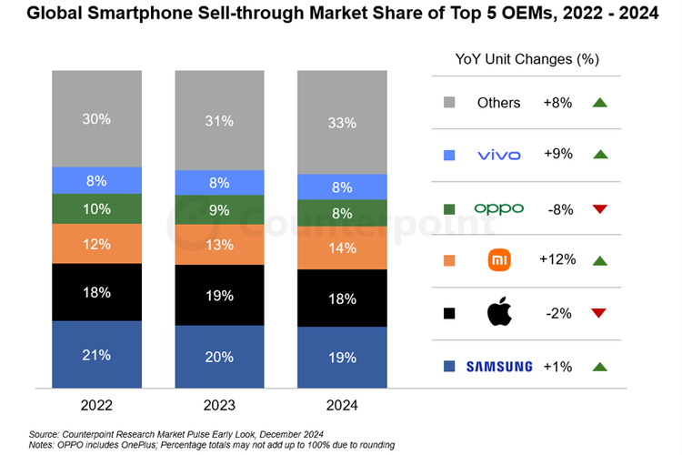 Apple dan Oppo merupakan dua vendor yang memiliki penurunan performa bisnis di 2024 kemarin,dengan tingkat penurunan penjualan ponsel 2 persen dan 8 persen dibanding periode yang sama tahun lalu.