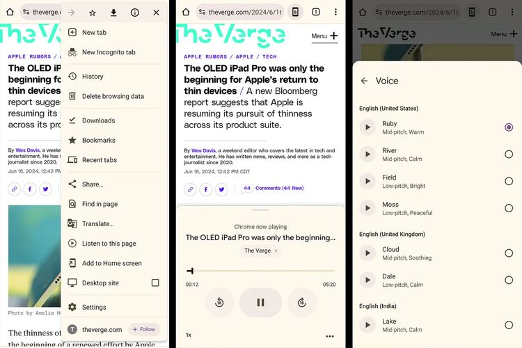 TheVerge Ilustrasi tampilan Listen to This Page di Chrome Android.