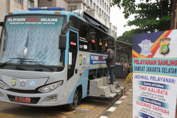 KOMPAS.com - Direktorat Lalu Lintas Polda Metro Jaya menyediakan layanan Samsat Keliling di sejumlah lokasi di Jakarta,Depok,Tangerang,dan Bekasi setiap harinya pada hari kerja.