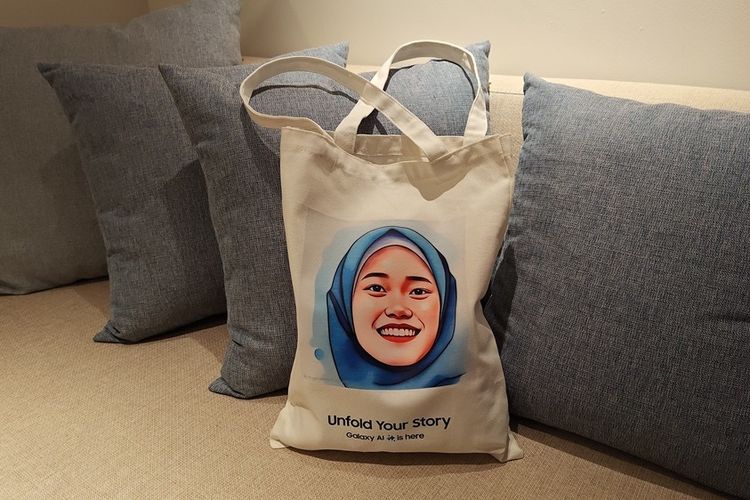 Fotonya diedit menggunakan fitur Portrait Studio sehingga tampilannya terlihat unik. Walaupun merupakan foto yang diedit AI,hasil cetakannya terlihat tajam pada tote bag dengan bahan kanvas.