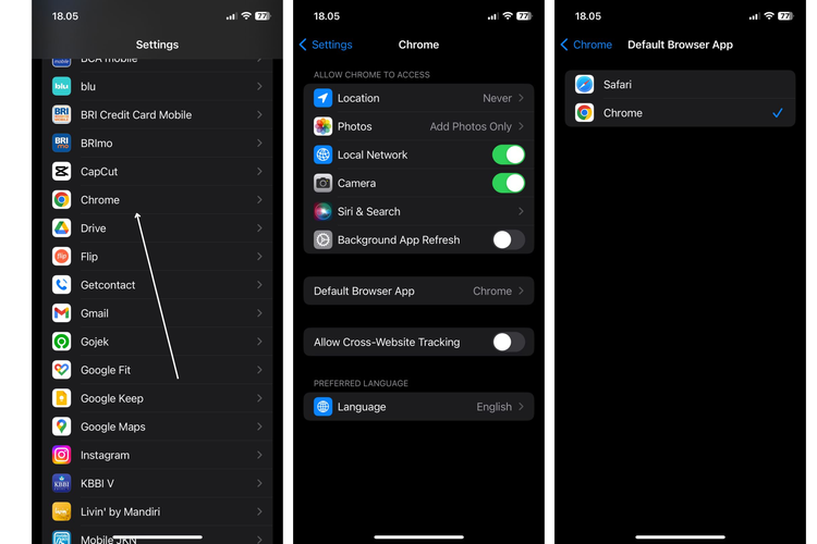 Pertama jadikan Google Chrome sebagai default browser Anda. Dengan mengatur browser default Anda ke Google Chrome,maka tautan peta akan terbuka di Google Maps saat menggunakannya. Kendati demikian pastikan terlebih dahulu Anda telah mengunduh Google Chrome di App Store. Berikut ini caranya: