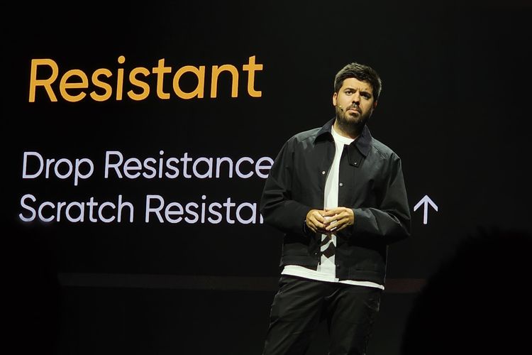 KOMPAS.com/Lely Maulida PR Manager Realme Spanyol,Alvaro Membrillera saat mempresentasikan Realme GT 6 di acara peluncuran ponsel flagship anyar mereka di Milan,Italia,Kamis (20/6/2024).