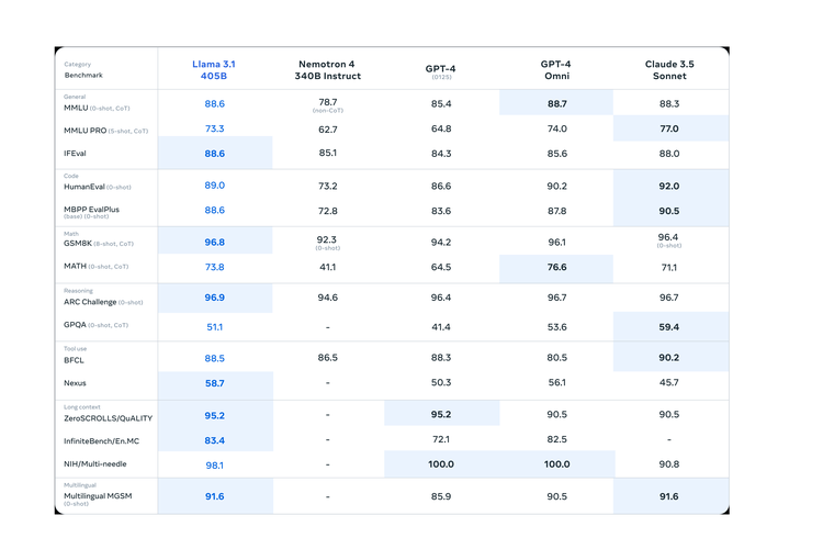Secara rinci,pengujian Meta menunjukkan bahwa Llama 3.1 405B mampu mengalahkan Nemotron 4 340B Instruct,GPT-4,GPT-4o,dan Claude 3.5 Sonnet dalam pengujian IFEval,GSM8K,ARC Challenge,Nexus,serta ZeroSCROLLS/QuALITY.