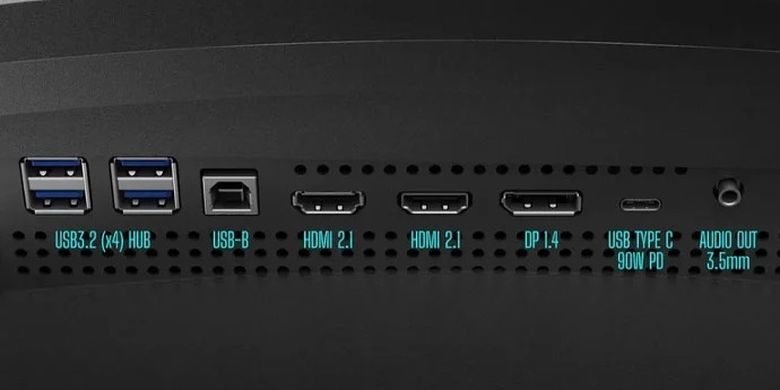 Rangkaian konektor yang disediakan mencakup 1x Display Port 1.4,2x HDMI 2.1,1x USB-C (Power Delivery 90 watt),4x USB 3.2 tipe A,dan jack output audio 3,5 mm.