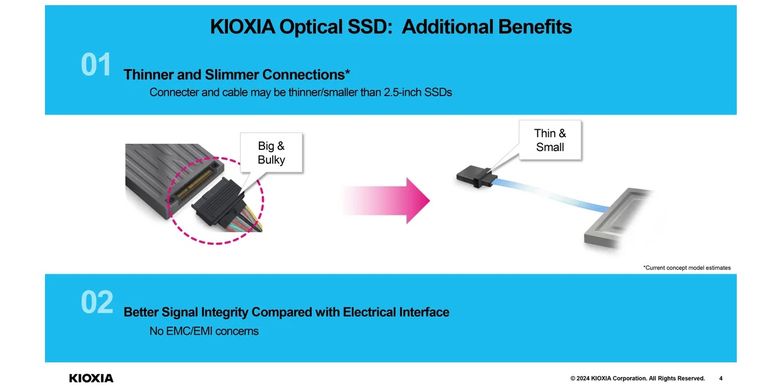 Kioxia Salah satu kelebihan interkoneksi fiber optic untuk SSD menurut Kioxia adalah ukuran kabel yang jauh lebih ringkas dibandingkan kabel tembaga konvensional
