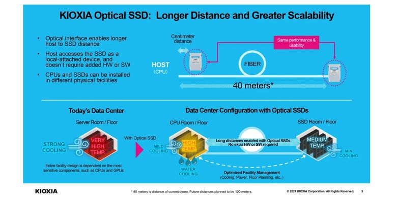 Kioxia Interkoneksi fiber optic memungkinkan perangkat storage ditempatkan berjauhan dari unit server sehingga ada benefit terkait manajemen suhu dan modularitas penyimpanan