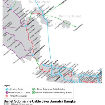 Biznet Kabel optik bawah laut BNCS-1 Biznet yang menghubungkan Pulau Jawa,dan Bangka.