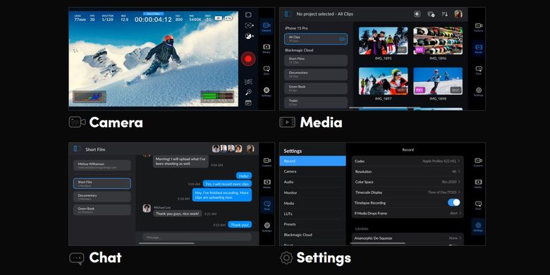 Blackmagic Antarmuka utama,browser media,menu setting,dan jendela chat di aplikasi Blackmagic Camera