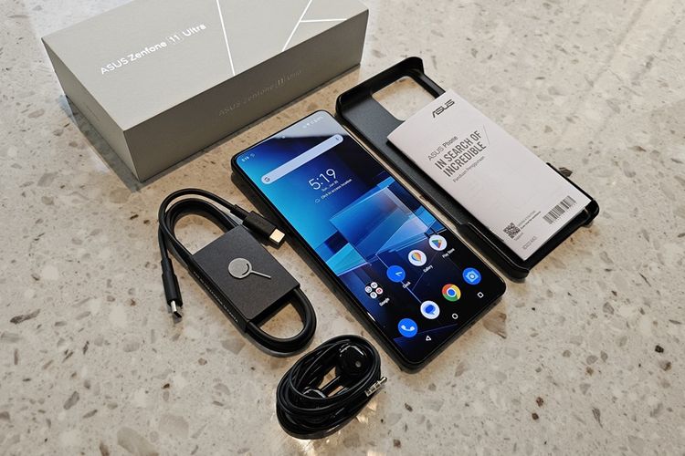 Isi kotak kemasannya meliputi unit Zenfone 11 Ultra,hardcase,panduan singkat sekaligus kartu garansi,USB-C ke C,earphone dengan jack 3,5 mm,serta SIM ejector untuk membuka baki SIM ponsel. Tidak ada adapter charger yang disertakan dalam kotak kemasan Zenfone 11 Ultra.