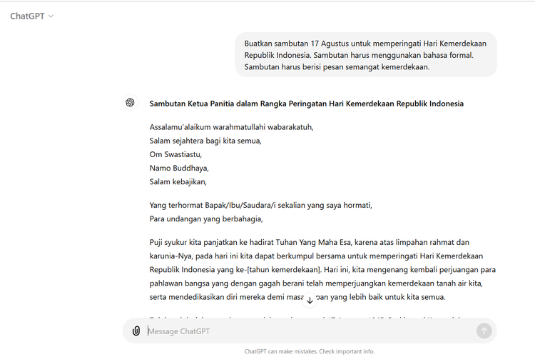 ChatGPT bisa menyajikan beberapa versi teks sambutan 17 Agustus.