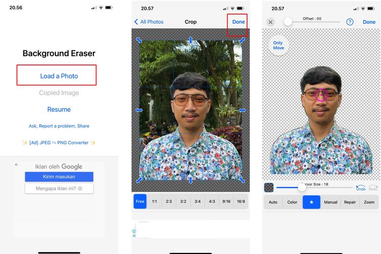 Seperti yang dijelaskan di atas,langkah pertama adalah pengguna bisa menghapus background foto yang sebelumnya belum berwarna merah. Hapus background foto bisa dilakukan lewat salah satu aplikasi Background Eraser dengan cara sebagai berikut: