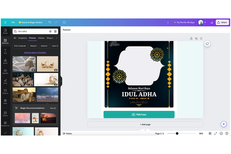 Bagi Anda yang kurang cocok dengan desain-desain twibbon dari link twibbonize.com,berikut ini beberapa cara membuat Twibbon hari raya Idul Adha sendiri dengan aplikasi Canva.