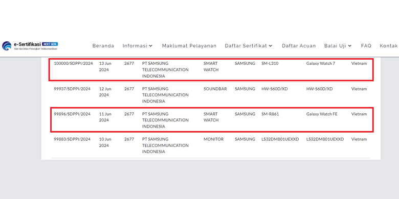 Selanjutnya,ada perangkat smartwatch dengan nomor model "SM-L310" di bawah sertifikat bernomor 100000/SDPPI/2024 yang terbit pada 13 Juni. Perangkat ini memiliki nama pemasaran "Galaxy Watch 7".