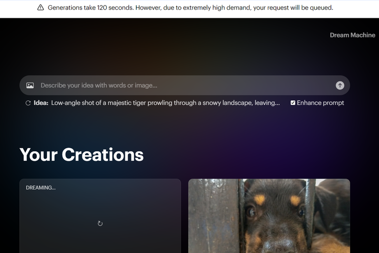 Dream Machine adalah model AI generatif (generative AI) yang mampu menghasilkan video dari perintah teks (prompt) dan gambar,sehingga mirip seperti teknologi AI text-to-video Sora bikinan OpenAI dan Kling besutan Kuaishou.