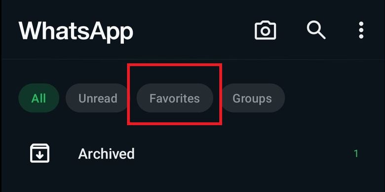 Tab Favorite berada sederet dengan tab filter lain,yang terletak di atas menu "Arsip/Archived". Tepatnya,tab Favorite berada di antara tab "Belum dibaca/unread" dan "Grup/groups".