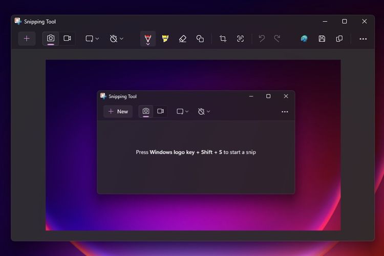 KOMPAS.com/ OIK YUSUF Snipping tool versi toolbar (atas) dan jendela aplikasi