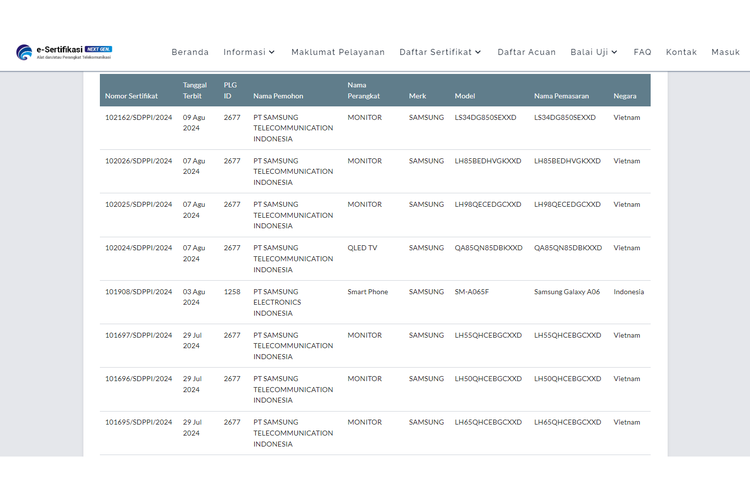 Pantauan KompasTekno,Rabu (14/8/2024),terdapat sertifikat bernomor 101908/SDPPI/2024 yang diajukan PT Samsung Telecommunication Indonesia pada 3 Agustus 2024.