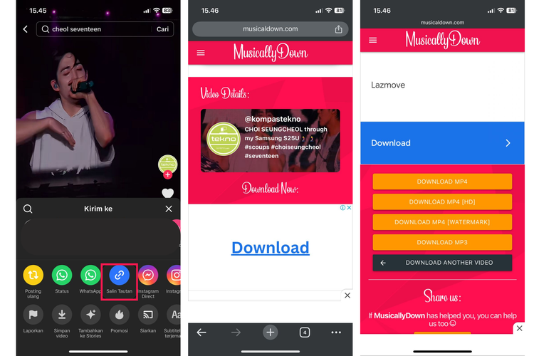 Ketuk opsi "Bagikan" dengan ikon panah,lalu pilih "Salin Tautan" untuk menyalin URL video tersebut.