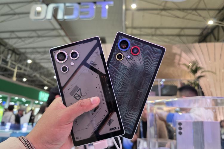 KOMPAS.com/ Galuh Putri Riyanto Penampakan prototipe HP Tecno Pova 7 disuntikkan teknologi Display Electronic Slurry atau disingkat DES,di Mobile World Congress (MWC) 2025 di Barcelona. Teknologi ini membuat HP bisa menampilkan grafis ala wallpaper di sisi pungung.