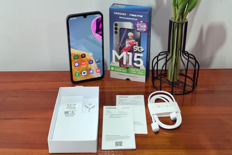 Isi dari paket pembelian Samsung Galaxy M15 5G terdiri atas unit ponsel itu sendiri,kabel charger USB Type-C,buku panduan,dan SIM card ejector.