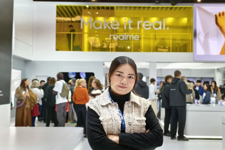 Kompas.com/BILL CLINTEN Public Relations Lead Realme Indonesia,Krisva Angnieszca ditemui di booth Realme di ajang MWC Barcelona 2025,Senin (3/3/2025).