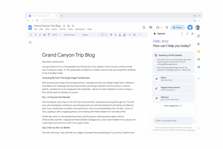 Di Docs,side panel Gemini dapat membantu pengguna dalam menulis dan menyempurnakan konten,meringkas informasi,serta membantu mencetuskan ide. Pengguna juga dikatakan bisa membuat konten berdasarkan file lain.