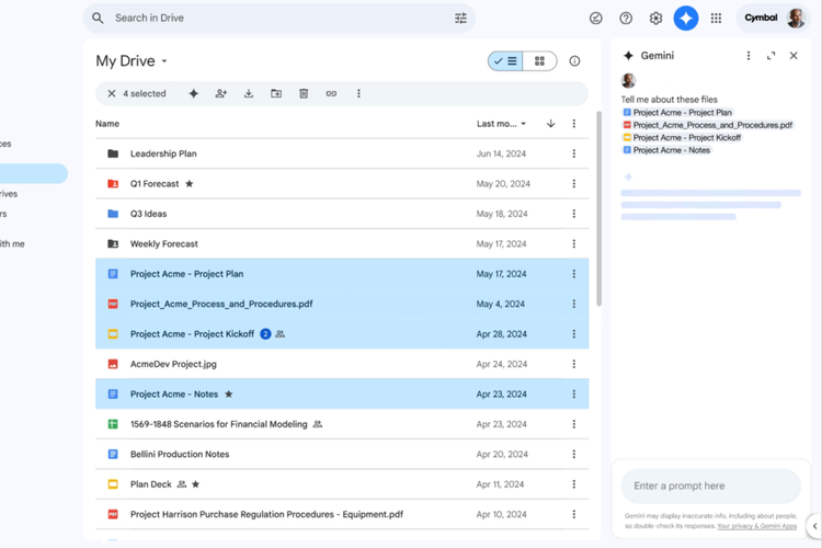 Terakhir di Drive,side panel Gemini diklaim mampu meringkas satu atau beberapa dokumen,mendapatkan informasi cepat dari suatu proyek,hingga mendalami suatu topik tanpa harus mencari atau mengeklik banyak dokumen.