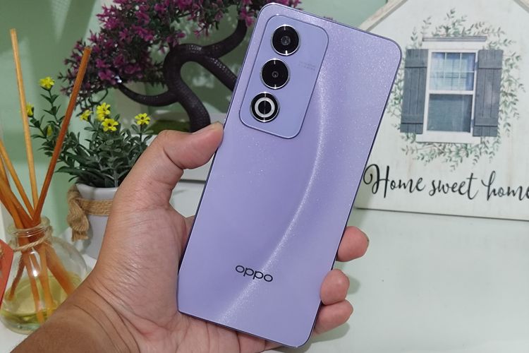 Kompas.com/BILL CLINTEN Oppo tetap menanamkan tampilan punggung mengilap yang tahan bekas sidik jari,alias Oppo Glow di punggung Oppo A3 Pro 5G. Khusus untuk warna Moonlit Purple yang KompasTekno dapat,cangkang ponsel ini menampilkan warna ungu terang yang mengilap,dengan motif yang berubah ketika punggung ponsel dilihat dari berbagai sisi.