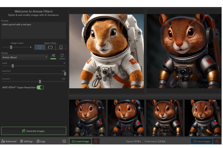 AMD mengatakan pengguna Amuse 2.0 bisa berkreasi membuat gambar dari nol maupun mengubah karya yang sudah ada menjadi benutk digital,lengkap dengan custom filter atau modifikasi melalui kecerdasan buatan.