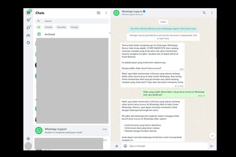 Beberapa saat kemudian,tim WhatsApp akan memberikan balasan,walaupun jawabannya masih dibuat oleh AI. Bila dirasa kurang jelas,pengguna juga bisa mengajukan pertanyaan lanjutan tanpa perlu mengulang proses dari awal.