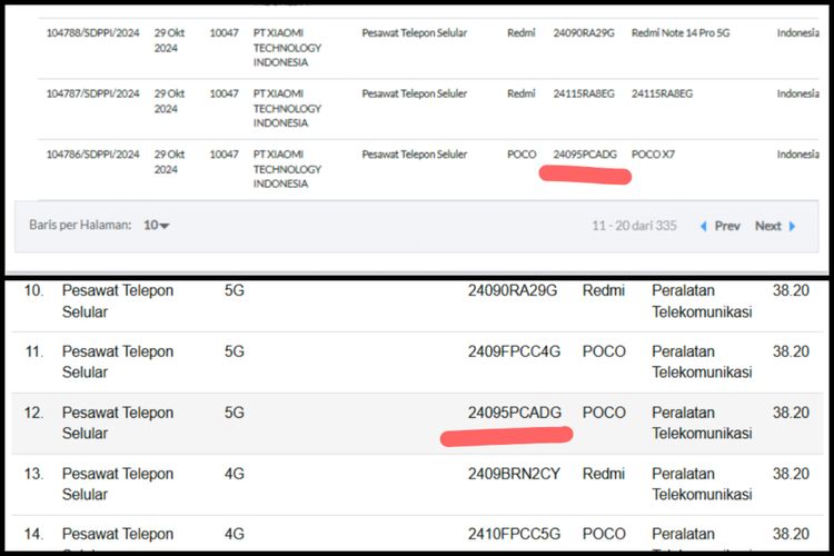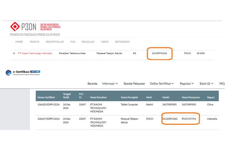 Kompas.com/Lely Maulida Sertifikasi Poco X7 Pro di laman TKDN (atas) dan Postel (bawah)