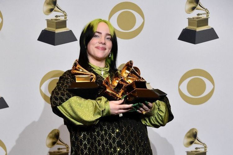 AFP/GETTY IMAGES NORTH AMERICA/ALBERTO E. RODRIGUEZ Penyanyi Billie Eilish,berpose dengan lima trofi Grammy Awards 2020 di Staples Center,Los Angeles,California,pada 26 Januari 2020. Billie Eilish meraup Grammy untuk Record of the Year,Album of the Year,Song of the Year,Best New Artist,dan Best Pop Vocal Album