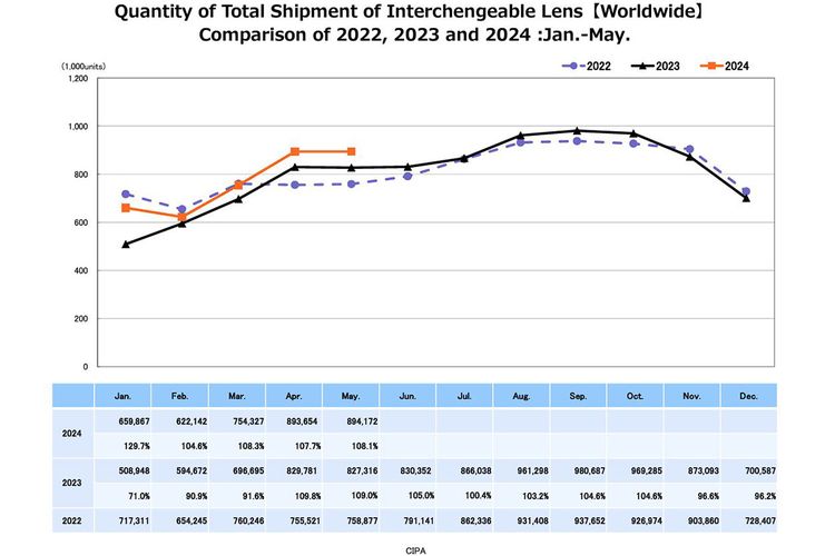 CIPA Penjualan kamera ILC antara Januari-Mei 2024 serta perbandingannya dengan 2023 dan 2022,menurut data dari Camera and Imaging Products Association (CIPA).