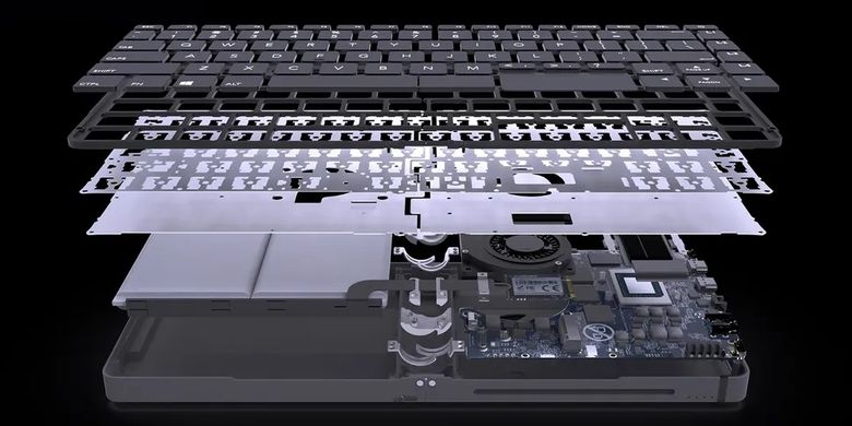 Dalam gambar struktur perangkat yang dibagikan,terlihat bahwa PC yang bersangkutan menempatkan komponen hardware di bodi keyboard,di balik deretan tombol.