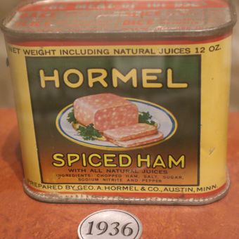 Wikipedia Daging kalengan Spiced Ham buatan Hormel Foods dari tahun 1936 yang kemudian dinamai ulang sebagai Spam,di Museum Spam di Austin,Amerika Serikat