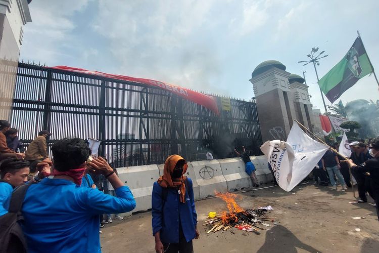 Setelah pagar dijebol,sejumlah demonstran pun merangsek ke bagian dalam pagar area Kompleks Parlemen.