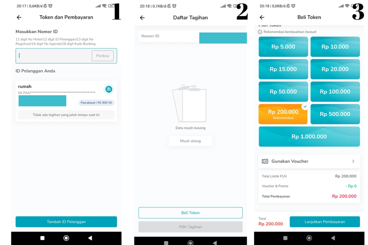 Pilih nominal token yang ingin dibeli,mulai dari Rp 5.000,Rp 10.000,hingga Rp 1 juta.